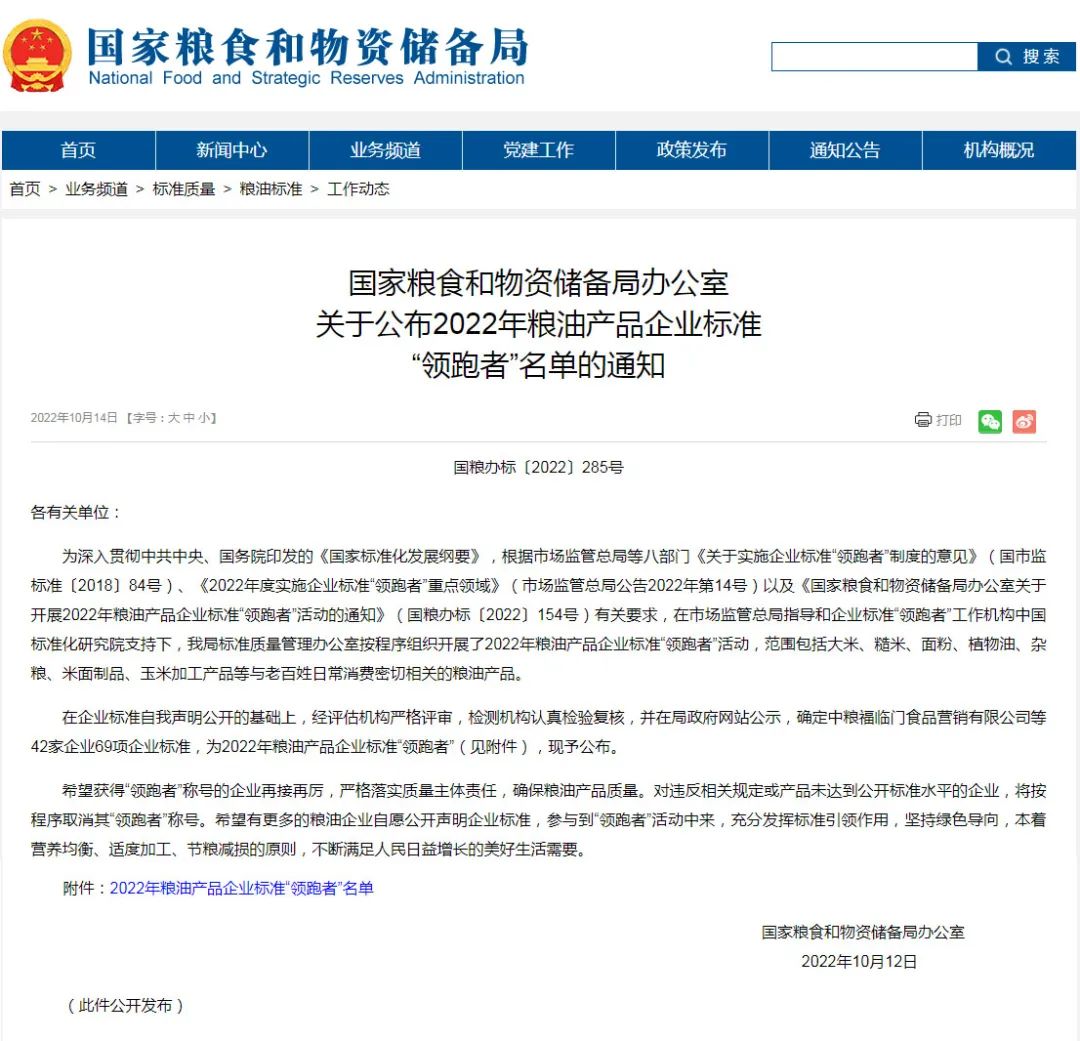 恭喜冠香居公司獲得2022年糧油產(chǎn)品企業(yè)標(biāo)準(zhǔn)領(lǐng)跑者!